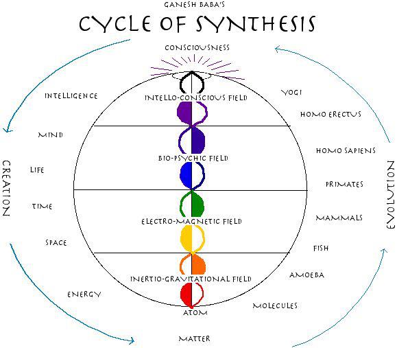 In Ganesh Baba’s model, following the downward arrow on the left, consciousness condenses into matter. Then, as it evolves back toward its source, more and more of the whole becomes comprehensible. As well as being reflected in the human body as the chakras, the Cycle of Synthesis mirrors Indian theory of the Yugas, a cycle of epochs in which the understanding of subtle things recedes as the earth moves away from the center of the universe, and increases again after it reaches its nadir and moves toward the center again.