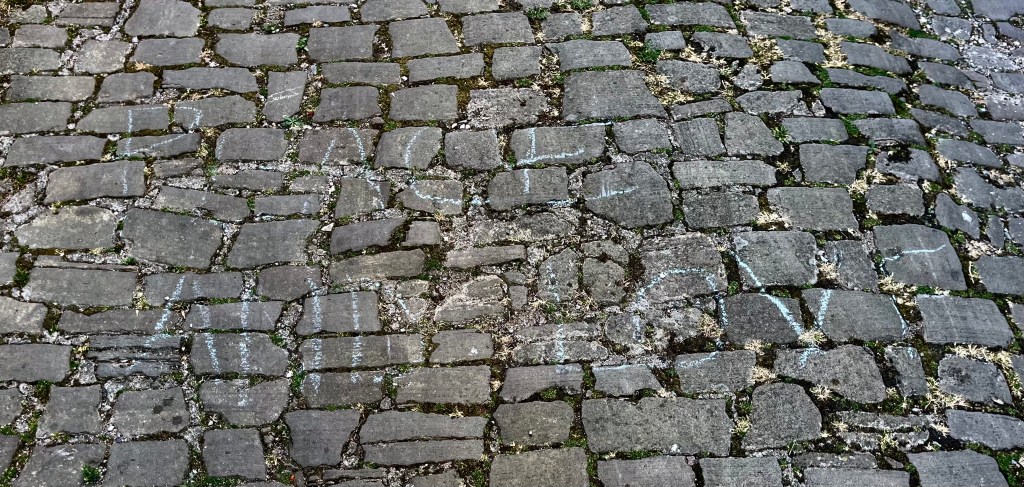 So it was that I noticed some writing in blue chalk on the cobblestones of Rue Saint Louis as I walked Mocha one morning this week, when I had just begun this essay. The message is a little hard to read, but the words are in English, even though I found it in our beautiful French village.