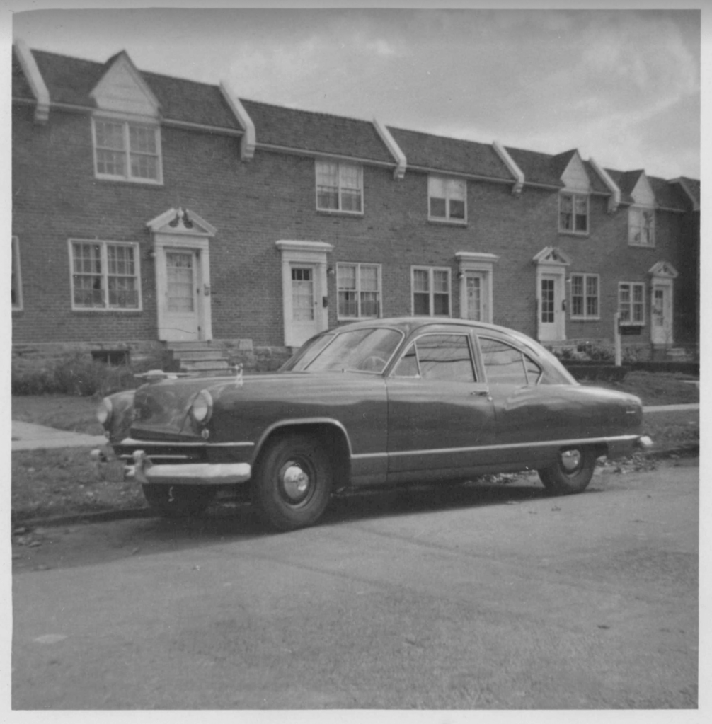 My parents’ second car, the Kaiser, in front of their house in Morton in the early 1950s.