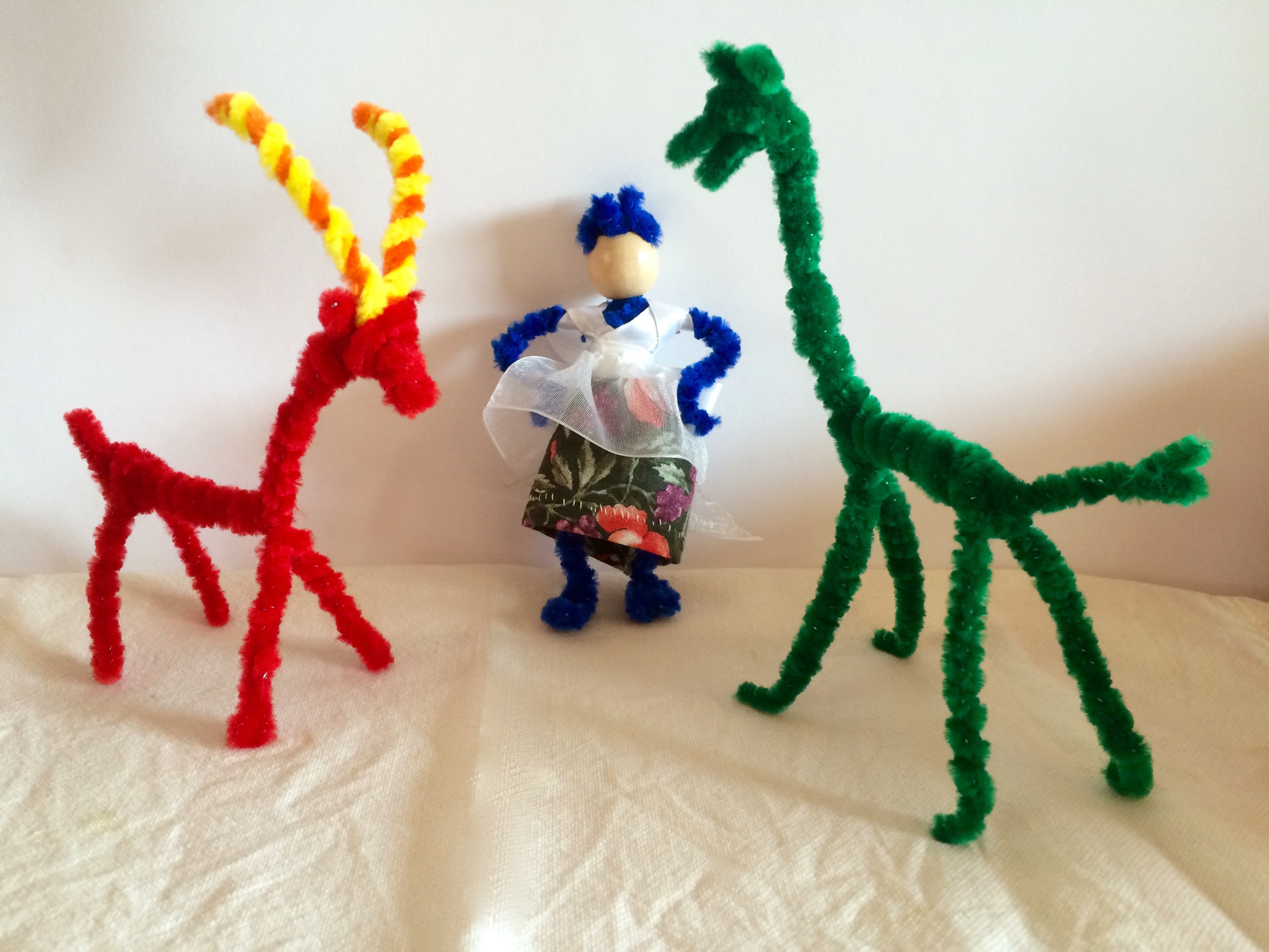 The blue pipe cleaner lady with the red plastic dress is upside down at the moment. The antelope is already packing their belongings—two acorn caps, a hard candy wrapped in foil and two carefully folded pieces of foil from candies eaten earlier—into her dress, which until recently topped a canister of whipped cream. They’d already chosen which of their things to leave behind and which to take. The ashtray is too heavy and they didn’t think they should touch the lovely china cigarette box. Anyway, they only have the lady’s whipped cream top dress to carry things in. Too bad the third acorn cap doesn’t fit. They’ll have to share plates at their next place, wherever that is.