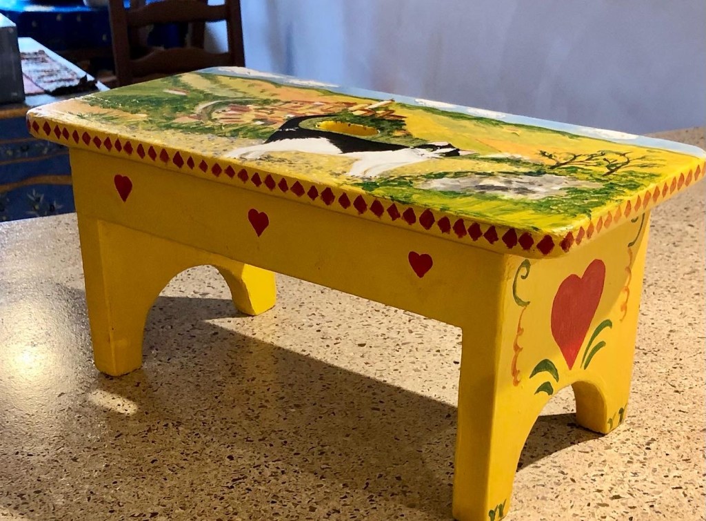 I continue to find painting cats on stools a most satisfying activity. Discovering a new old stool at Emmaüs, a brocante, vide maison, or eBay or Leboncoin is always magical. Repairing, sanding, and painting it gives me enormous pleasure.