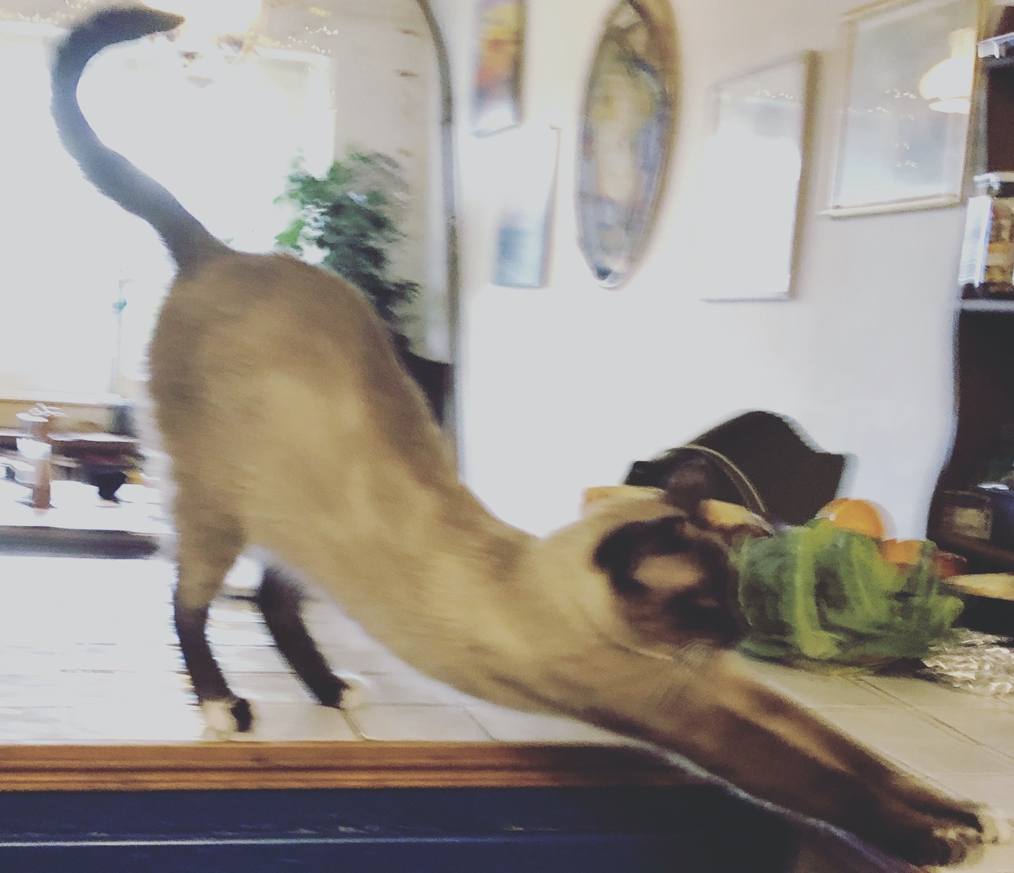 It occurs to me now that this series, Cats on Stools, is in part one of the gifts of Henri’s death. The other is that my heart has settled back into my chest after being in my mouth for the months when Henri was claiming more and more territory in the village. He’d taken to walking around it with me and Mocha in the weeks before his boldness caught up with him. He was fearless.