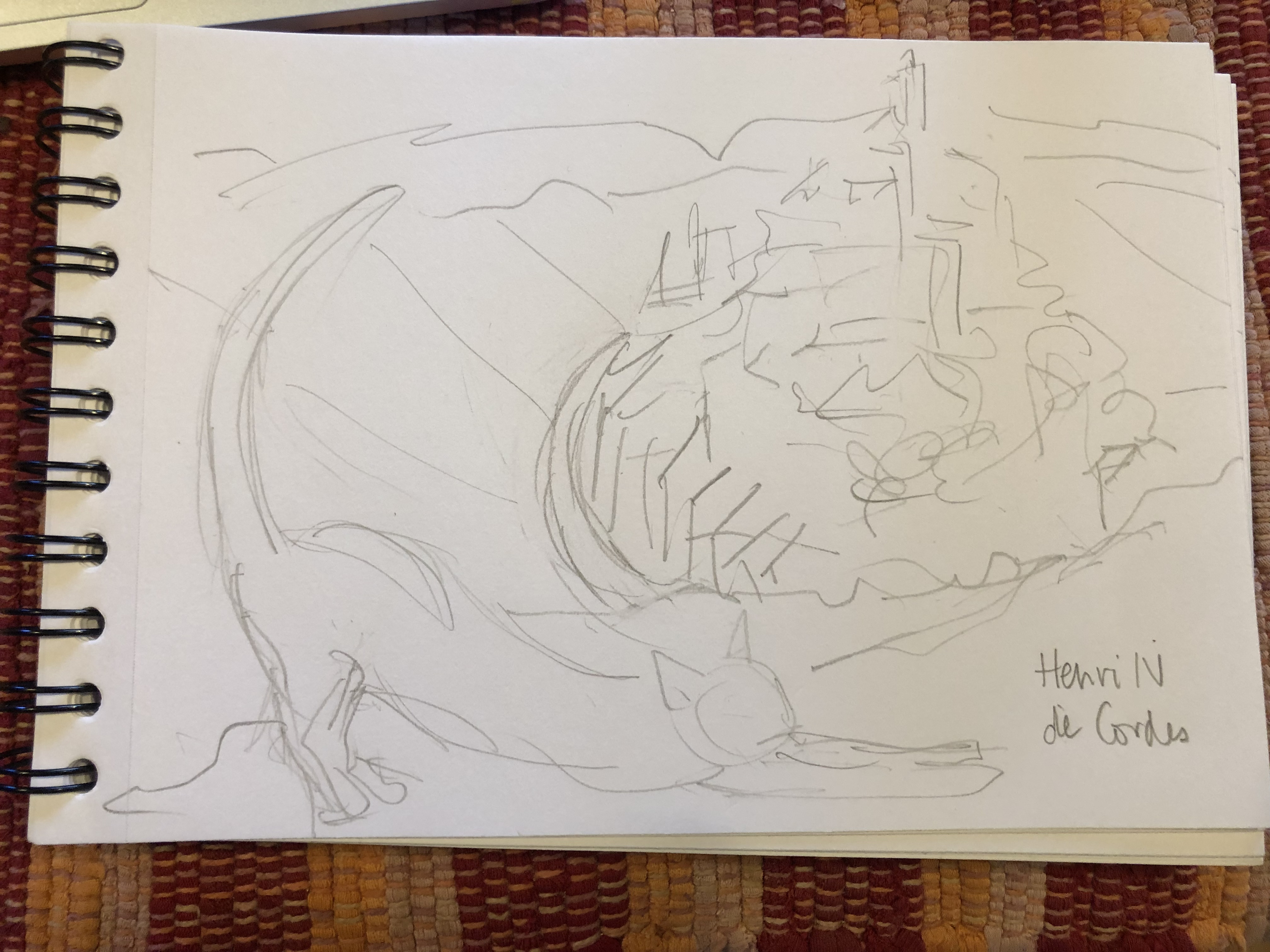 Mostly, I work from photos or, in the case of Minoushka à Cordes and my current project, Henri IV à Cordes, a painting. I’m using one of Cordes by Yves Breyer that I have on a postcard. Brayer’s work is perfect for using a a model because he gets so much character into simple strokes.