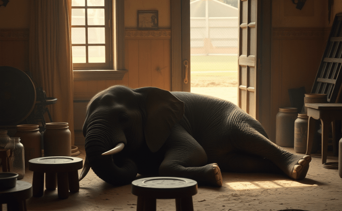 The elephant walks into the hut, which is now large enough to accommodate it easily. It lies down on a dusty carpet and looks at us. After a time it gets up and leaves.