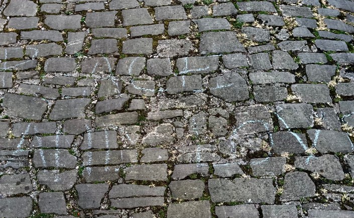 So it was that I noticed some writing in blue chalk on the cobblestones of Rue Saint Louis as I walked Mocha one morning this week, when I had just begun this essay. The message is a little hard to read, but the words are in English, even though I found it in our beautiful French village.