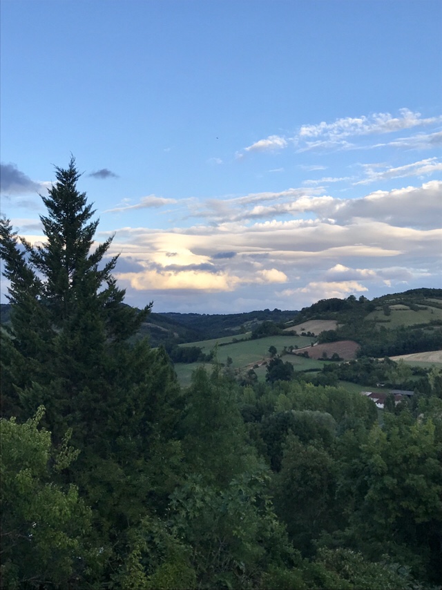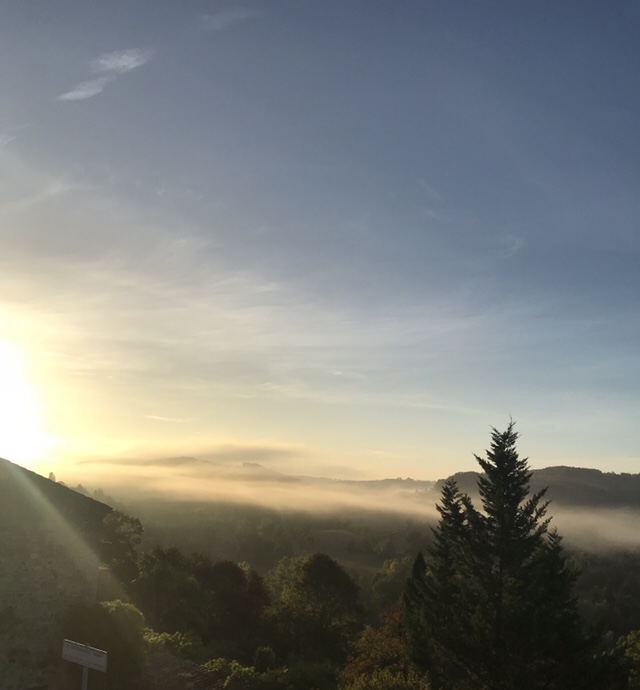 Most mornings I wake up before sunrise, open the shutters, roll out my rug and light a candle, and then do some stretches, breathe, and meditate for a while. When I open my eyes, the sun is up – or on its way up – and the view is so lovely, I try to save it in a photo.